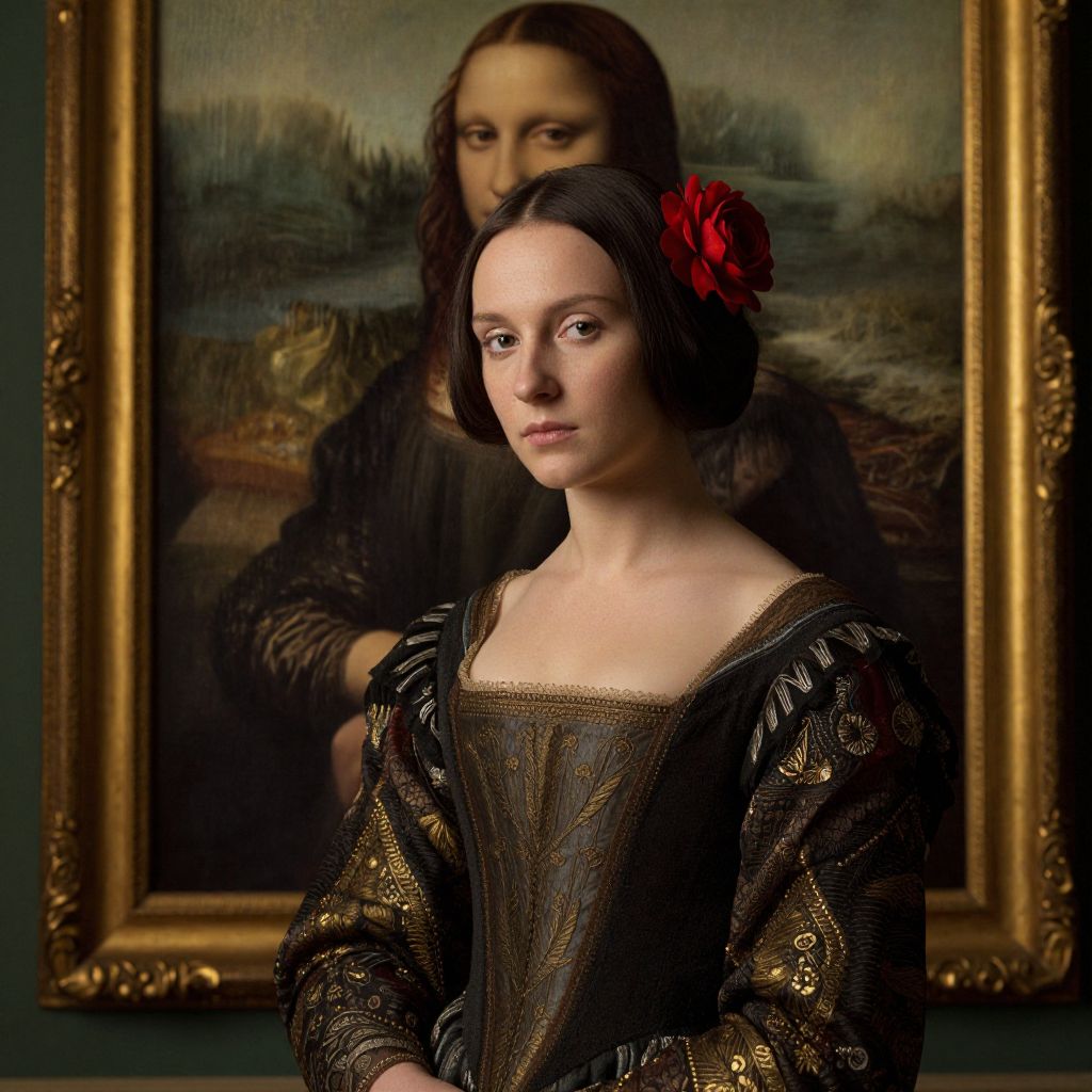 Photograph-like digital artwork featuring a pale-skinned woman with short, dark brown hair adorned with a red flower. She wears a Renaissance-style, black and gold brocade dress with puffed sleeves. Behind her, a large, framed painting of a similar woman with long, dark hair and a serene expression, dressed in a dark, flowing garment, is visible. The background is dimly lit, emphasizing the intricate details of her dress and the painting. The image blends realistic and surreal elements, creating a historical yet contemporary effect. The style is reminiscent of hyper-realism.