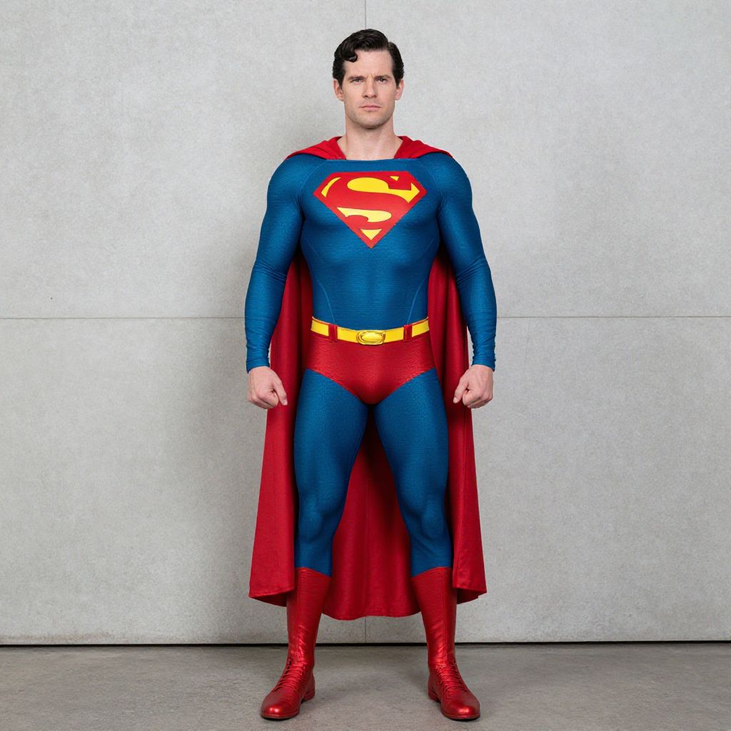 "Val Zod Superman, a man in a superman suit standing in front of a wall"