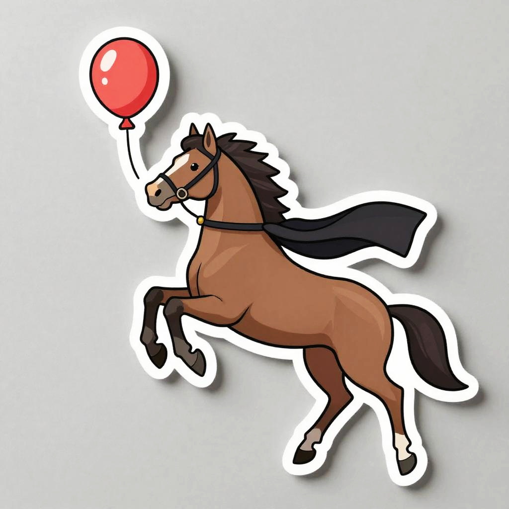 Die cut sticker of a mare leaping to catch a balloon wearing a cape