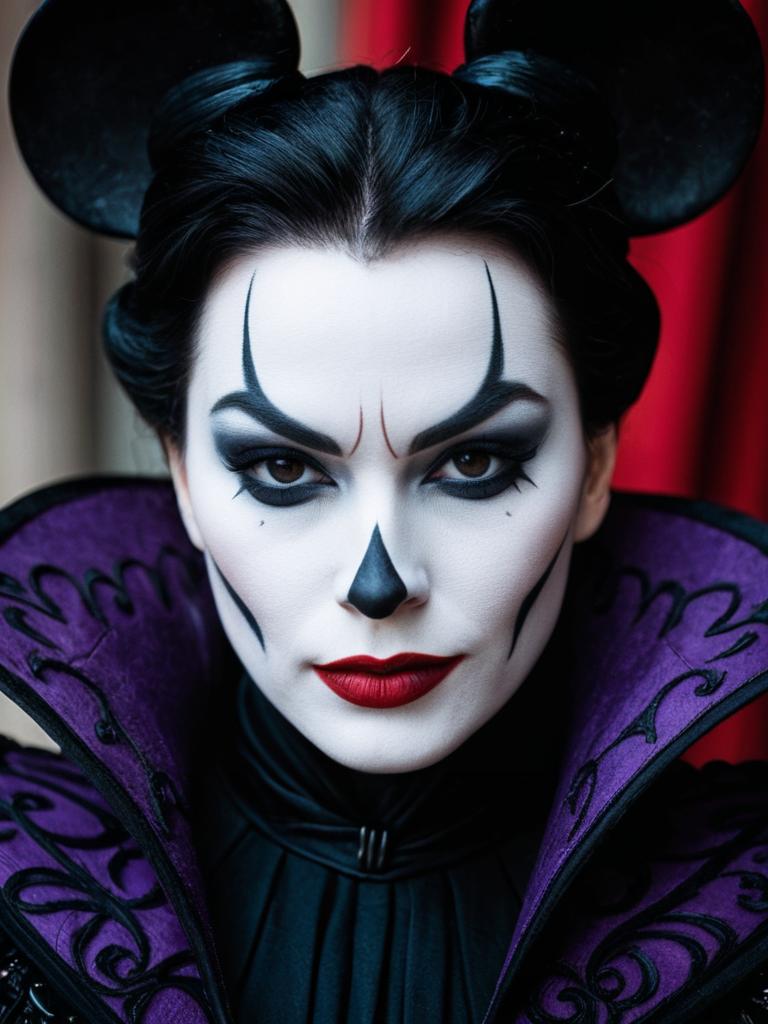 Close-up portrait of a woman dressed as a Disney villain. She has pale makeup with dramatic dark eye makeup, bold red lipstick, and defined eyebrows. She wears a black headband with large black ears and a high purple collar, embodying a classic villainous look.
