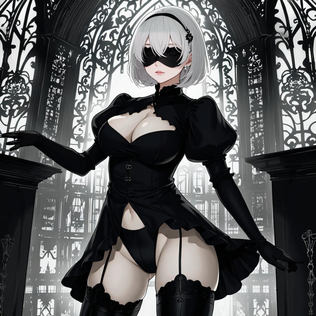 Digital anime-style drawing of a white-haired woman with a black blindfold, standing in a gothic archway with intricate ironwork. She wears a black, cleavage-revealing dress with puffed sleeves and a high collar, paired with black gloves and stockings. Her outfit exposes her midriff and upper thighs. The background features tall, ornate windows with a bright, white sky outside. The woman's expression is neutral, and her hair is cut in a short bob. The image has a stark, high-contrast black and white color scheme.
