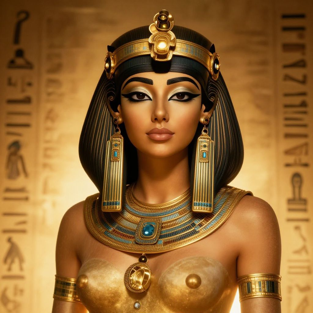 Cleopatra body in a cinematic portrait, close-up focus on her elegant pose and detailed makeup inspired by ancient Egypt, bold eyeliner and lavish jewelry, warm golden tones complementing her skin, surrounded by subtle hieroglyph textures and a soft glowing aura.