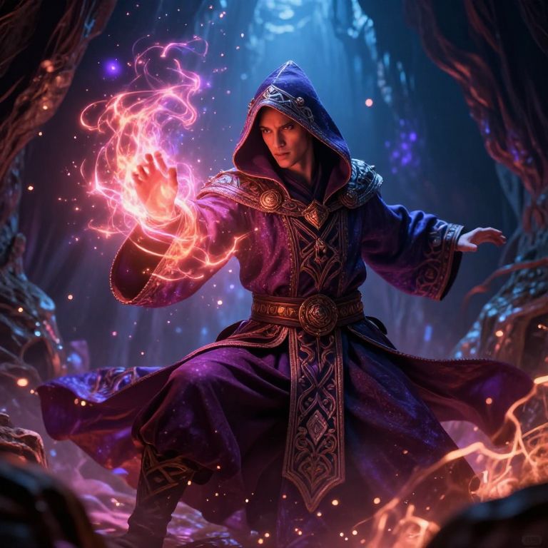 A stable diffusion mage channeling elemental magic in a mystical cavern, vibrant particles and glowing sparks blending seamlessly around the figure, elaborate hooded cloak with intricate patterns, dynamic pose with intense focus, dramatic lighting and magical aura.