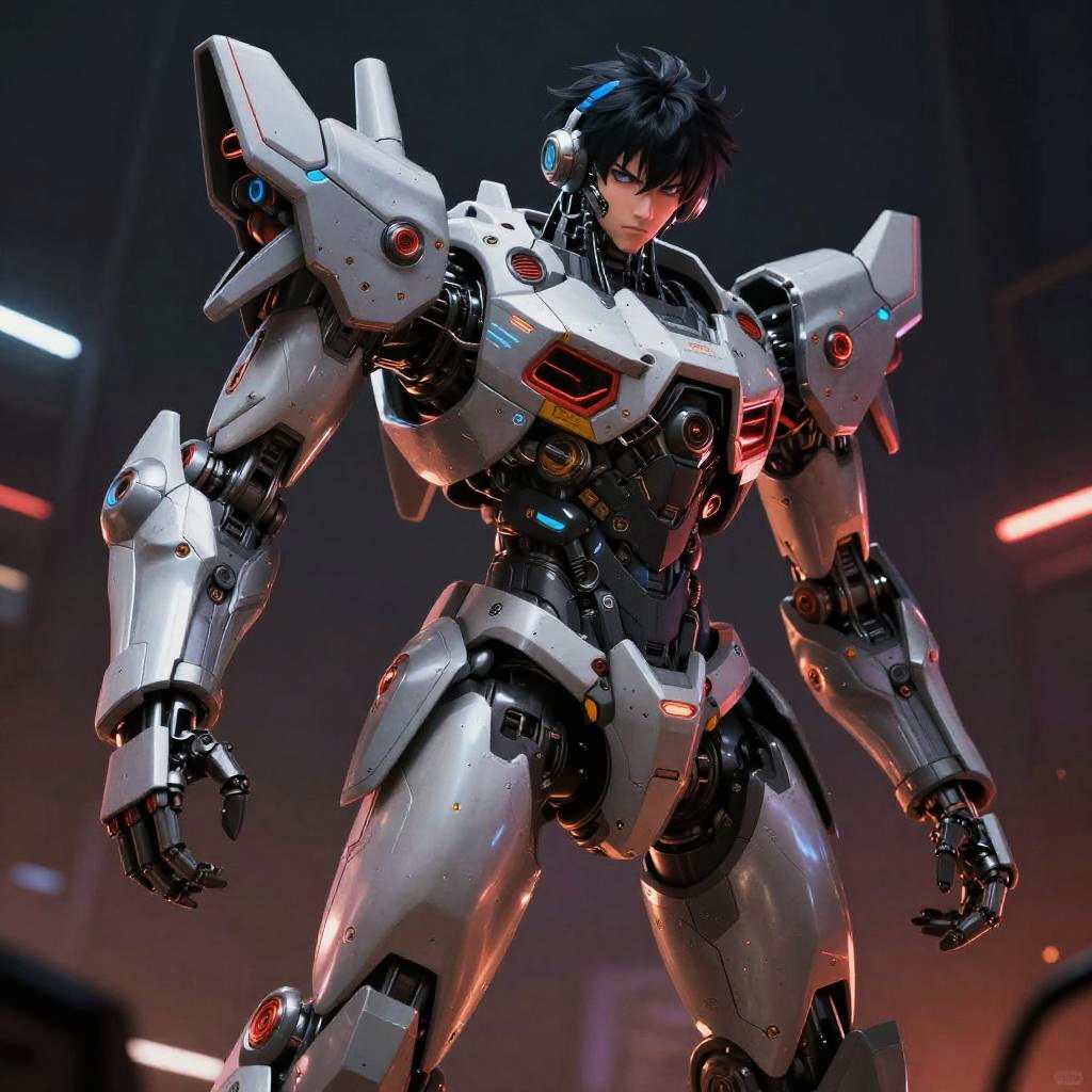 AI art anime generator free, edgy sci-fi anime robot warriors with sleek mechanical designs, intense action poses, dark moody backgrounds with neon glows, sharp contrast, detailed textures, cinematic lighting, highly detailed anime illustration style