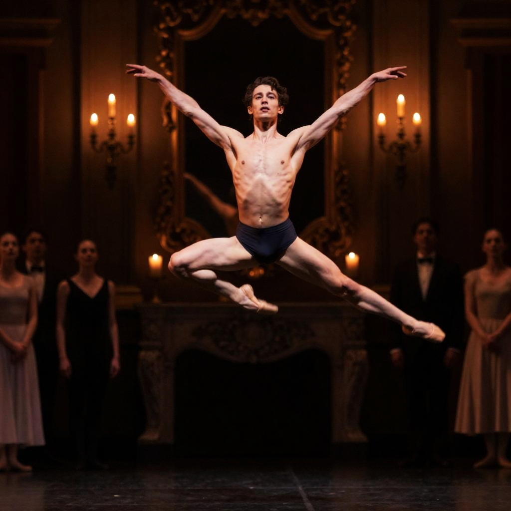 A shirtless male dancer mid-air, executing a high leap with outstretched arms and legs. Richly decorated, dimly lit stage, ornate mirror and candelabrum in background. Audience with candles, blurred expressions. Multiple people in background, some in formal attire. Dark, opulent setting.