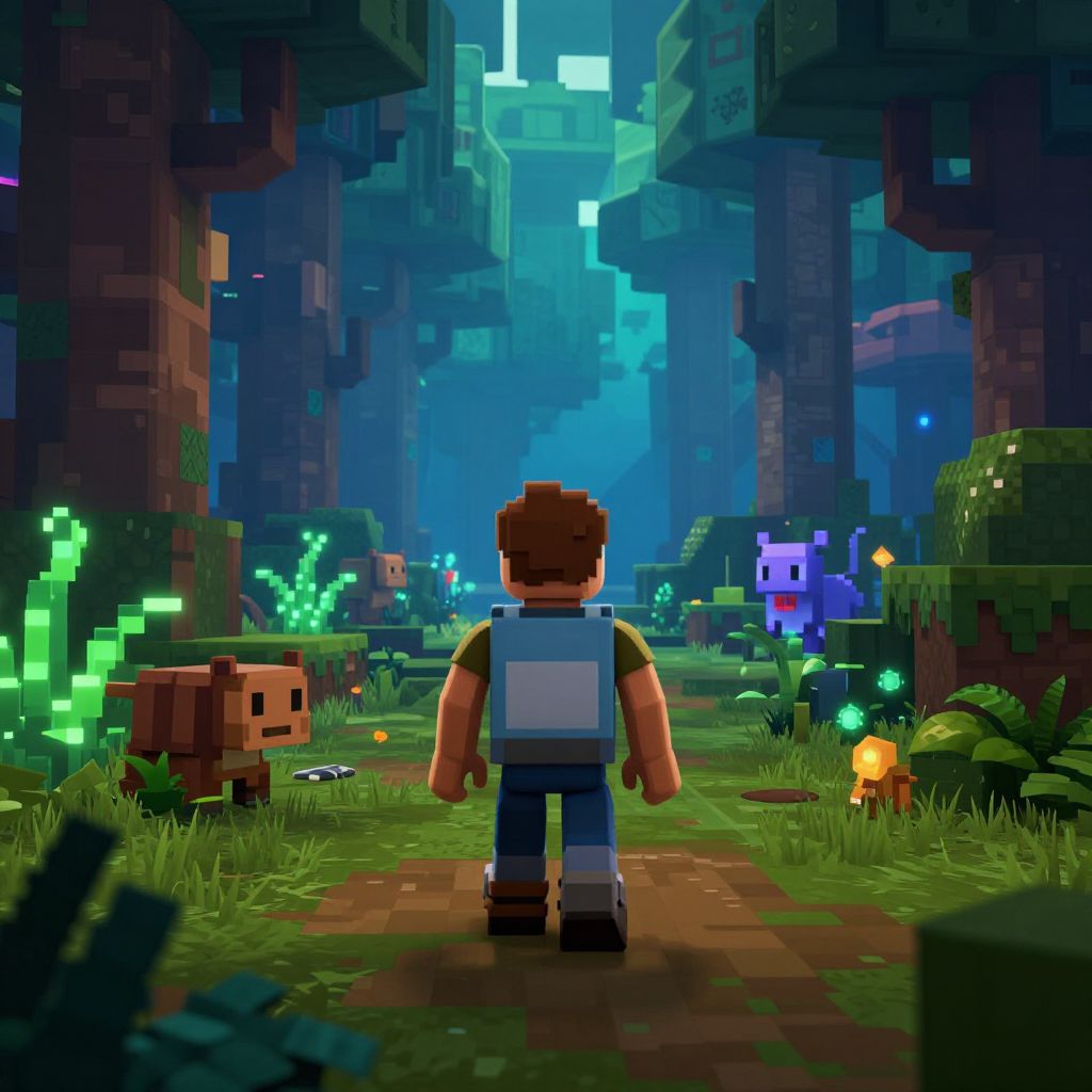 Roblox man exploring a mysterious virtual jungle, blocky trees and exotic pixel animals around, glowing bioluminescent plants casting soft light, adventurous mood with a mix of fantasy and sci-fi elements, detailed 3D style.