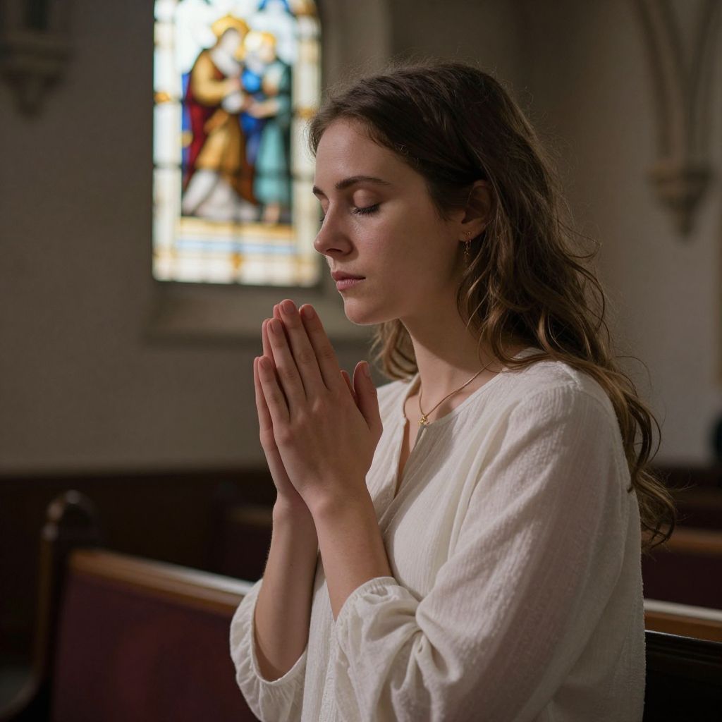Photograph of a young Caucasian woman with long, wavy brown hair, wearing a white, loose-fitting, long-sleeve blouse. She is standing in a dimly lit church, eyes closed, and hands clasped in prayer with fingers pressed together. A delicate gold necklace rests around her neck. The background shows a blurred, colorful stained-glass window with religious figures and an arched wall. The lighting highlights her serene expression and the soft texture of her blouse, creating a peaceful, contemplative atmosphere.