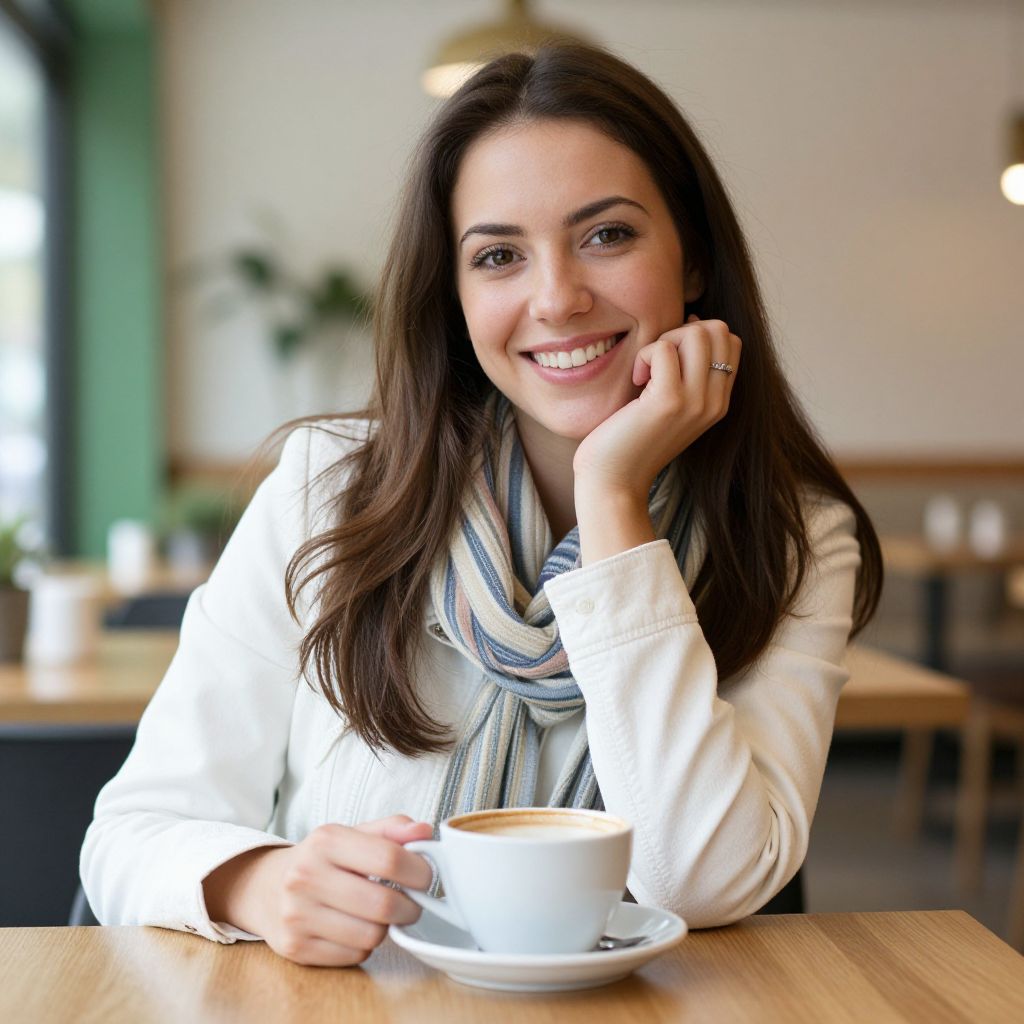 A photograph of a smiling woman with long brown hair, wearing a white jacket over a striped scarf, sitting at a wooden table in a cozy café. She rests her chin on her hand, with a white coffee cup and saucer in front of her. The background is slightly blurred, featuring green and white elements, creating a warm and inviting atmosphere.