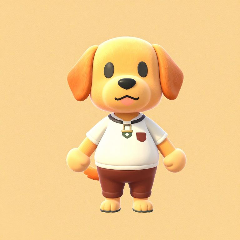 This is a digital 3D rendering of a cute, cartoon-style, anthropomorphic golden retriever dog. The dog has a round head with floppy ears, large black oval eyes, and a small black nose. It wears a white short-sleeved shirt with a red pocket and a triangular collar with a small pendant. The dog also wears red pants. The background is a solid, light peach color. The dog's texture appears smooth and slightly shiny, with a soft, plush-like appearance. The overall style is simple and charming, reminiscent of children's animated characters.