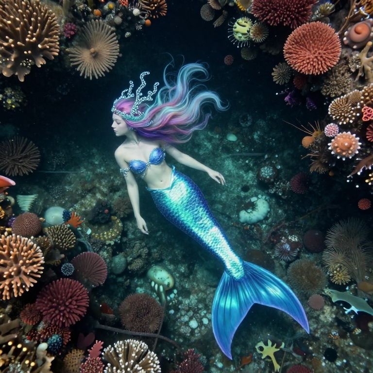 An enchanting underwater scene, reminiscent of surrealism, showcases a mysterious mermaid with flowing, iridescent hair and intricate sea-weaved accessories as she gracefully navigates through a vibrant coral forest from an aerial perspective. Her mesmerizing presence and the fantastical creature blend seamlessly with aquatic elements, evoking awe and wonder while transporting viewers into a dreamlike world where reality intertwines with imagination in a harmonious dance of light and color.