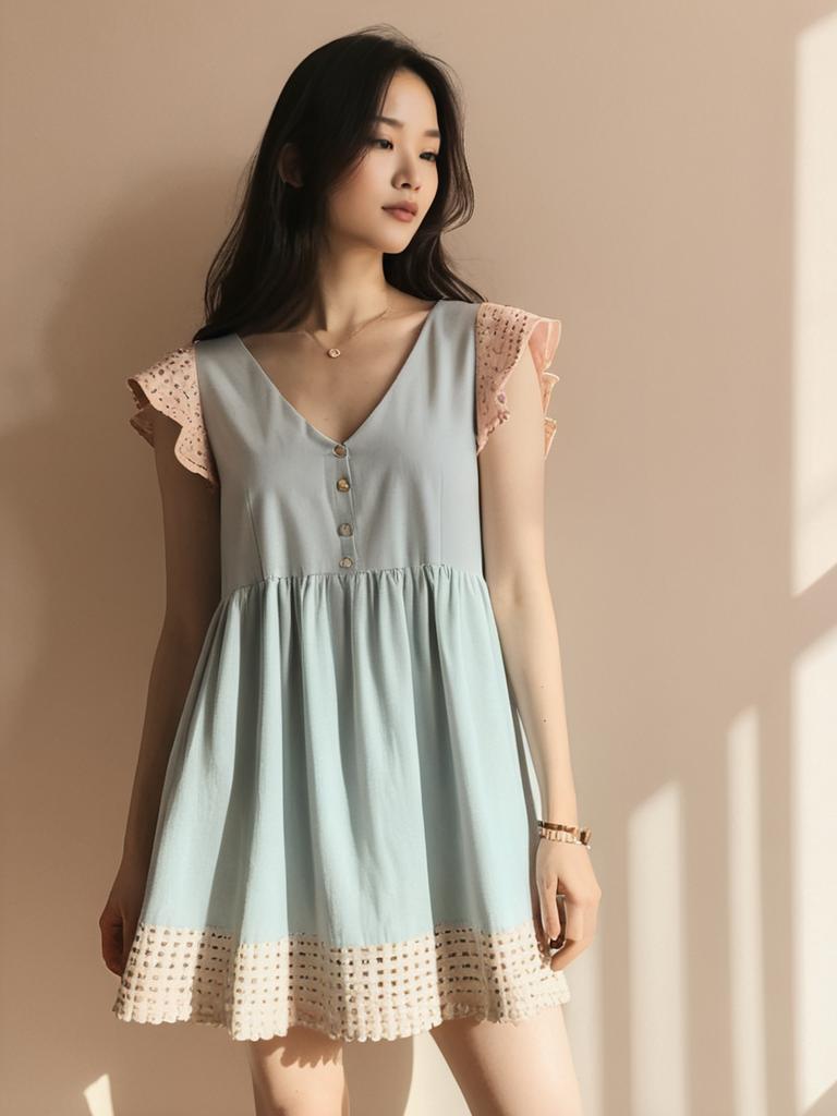 Woman, cocktail attire, lace sheath dress in deep teal, thin spaghetti straps, V-neckline, fitted waist with see-through lace details, scalloped lace hem, mini-length, invisible back zipper, solid color fabric lining, plain white studio background. --sref 1400