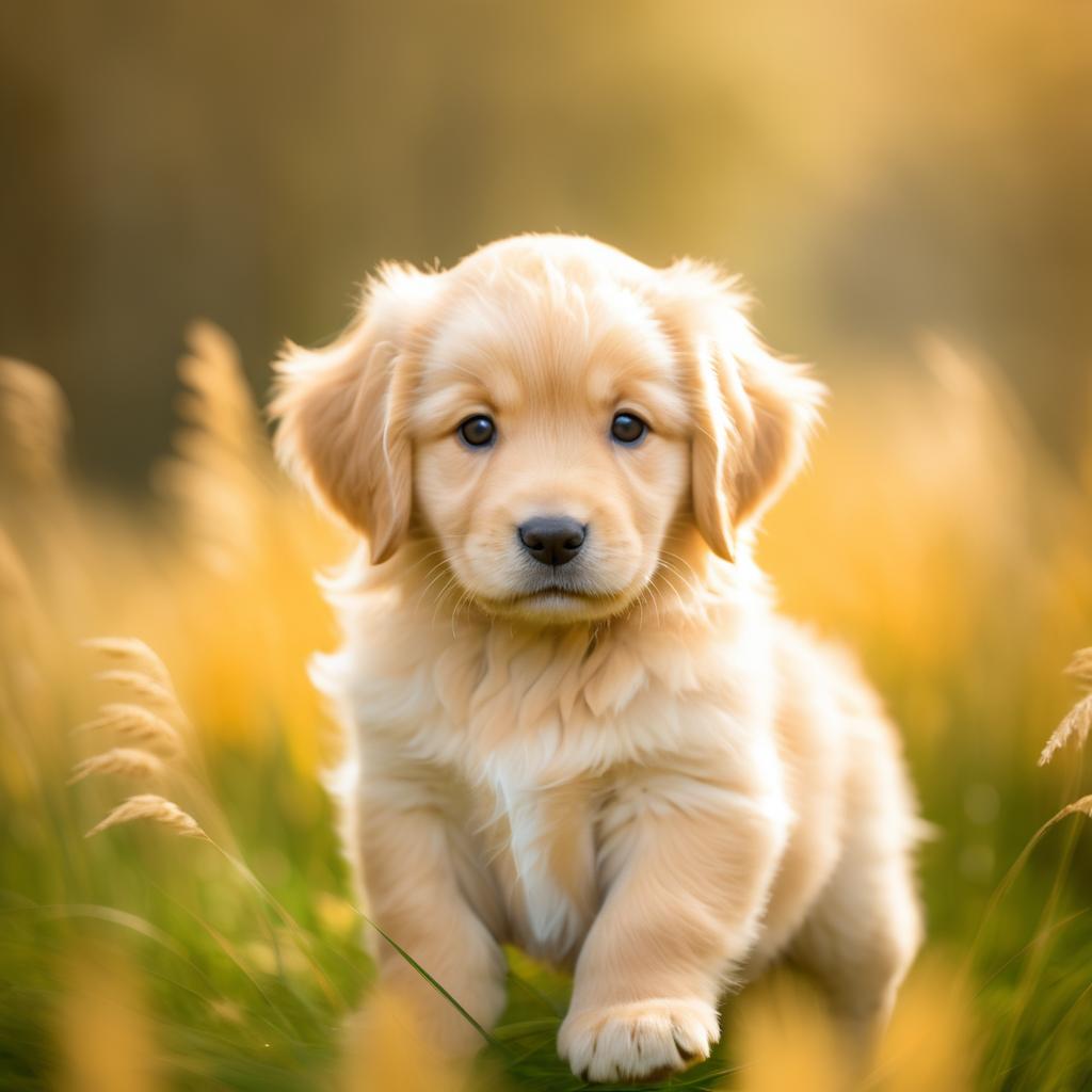 Photo of a gorgeous golden retriever puppy in whimsical, soft focus, inspired by Bob Ross, 8K, elegant and intricate.