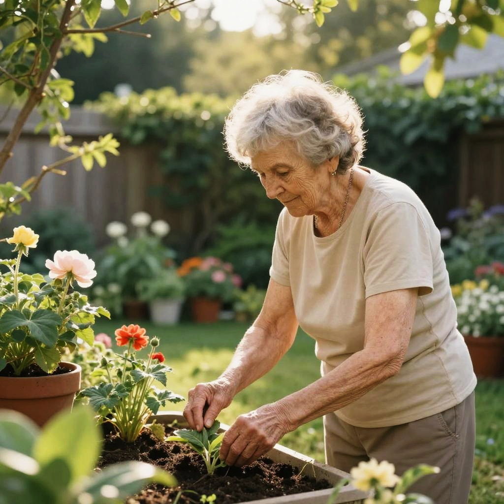 Old lady in crop top gardening in a lush green backyard, surrounded by blooming flowers and plants, sunlight filtering through trees, peaceful and serene setting, natural textures