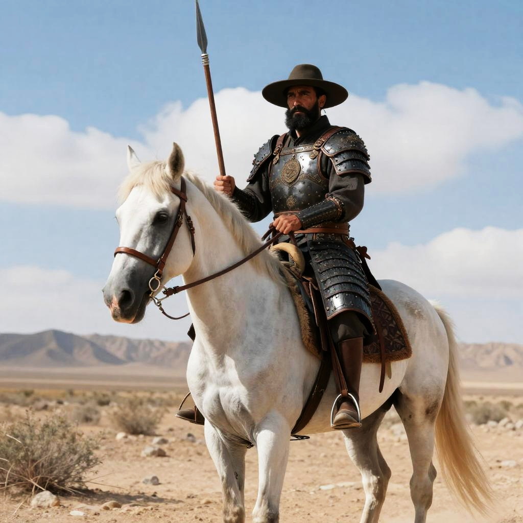 A male warrior with short dark hair rides a horse across a dark, barren landscape at sunset. He holds two swords in both hands, his expression intense and focused. A large, dark cloud looms in the background. The sky is orange and purple. The horse is mid-gallop. The man wears a dark, flowing cloak.