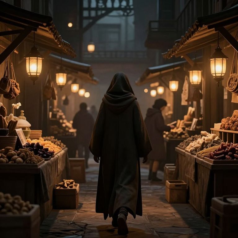 In a moody, atmospheric 3D-rendered marketplace illuminated by warm, vintage-style lanterns, a cloaked figure walks through shadowy stalls filled with dried goods, evoking a sense of mystery and introspection as customers navigate the interplay of light and darkness.