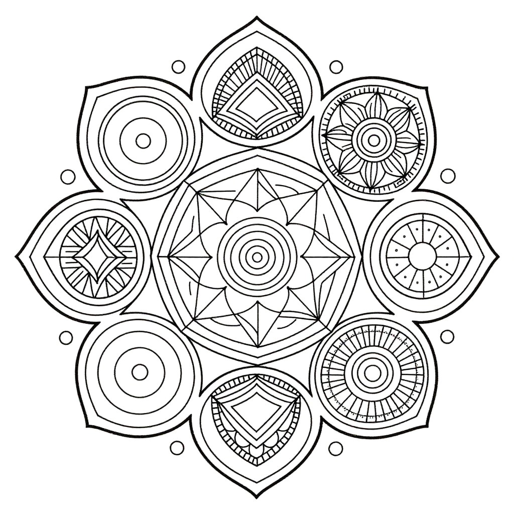 Black and white coloring pages showcasing geometric mandalas and abstract shapes, rendered in symmetrical patterns and fine details to inspire mindfulness and artistic expression.