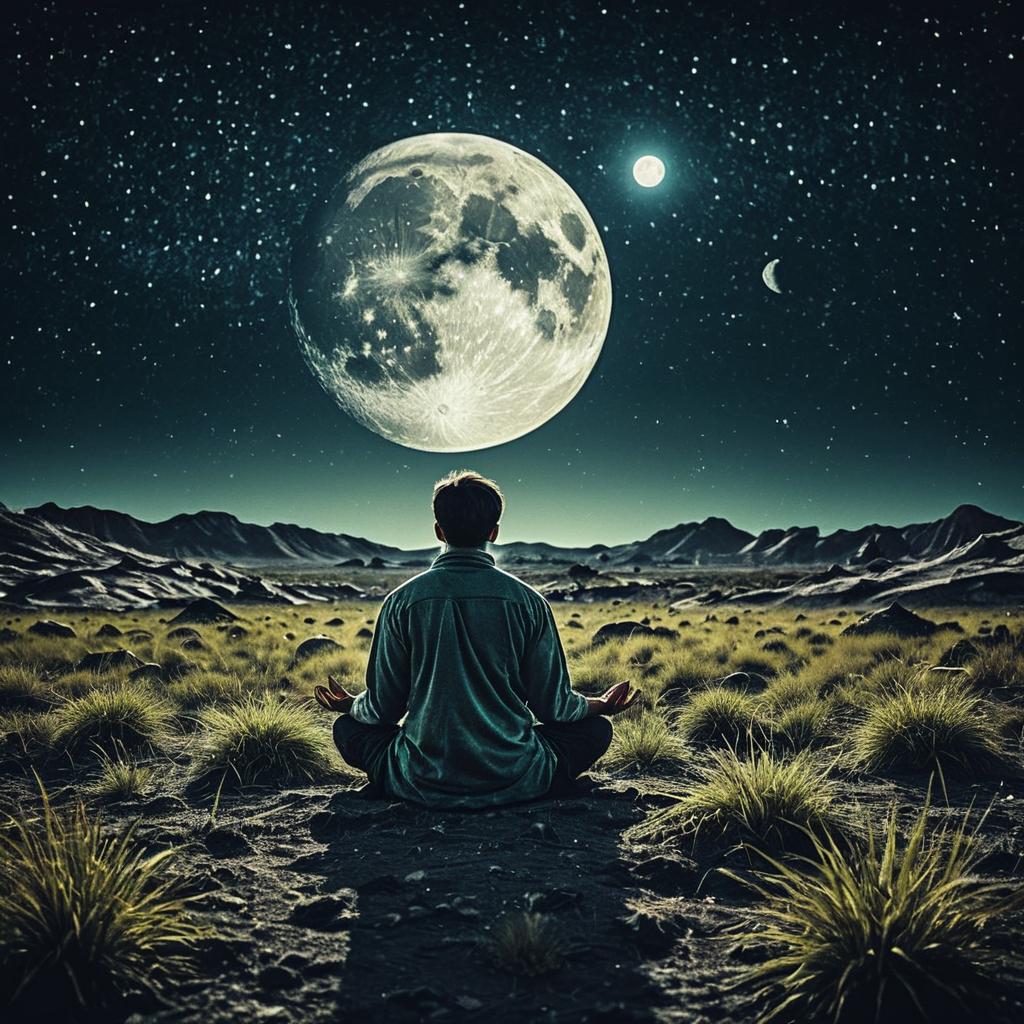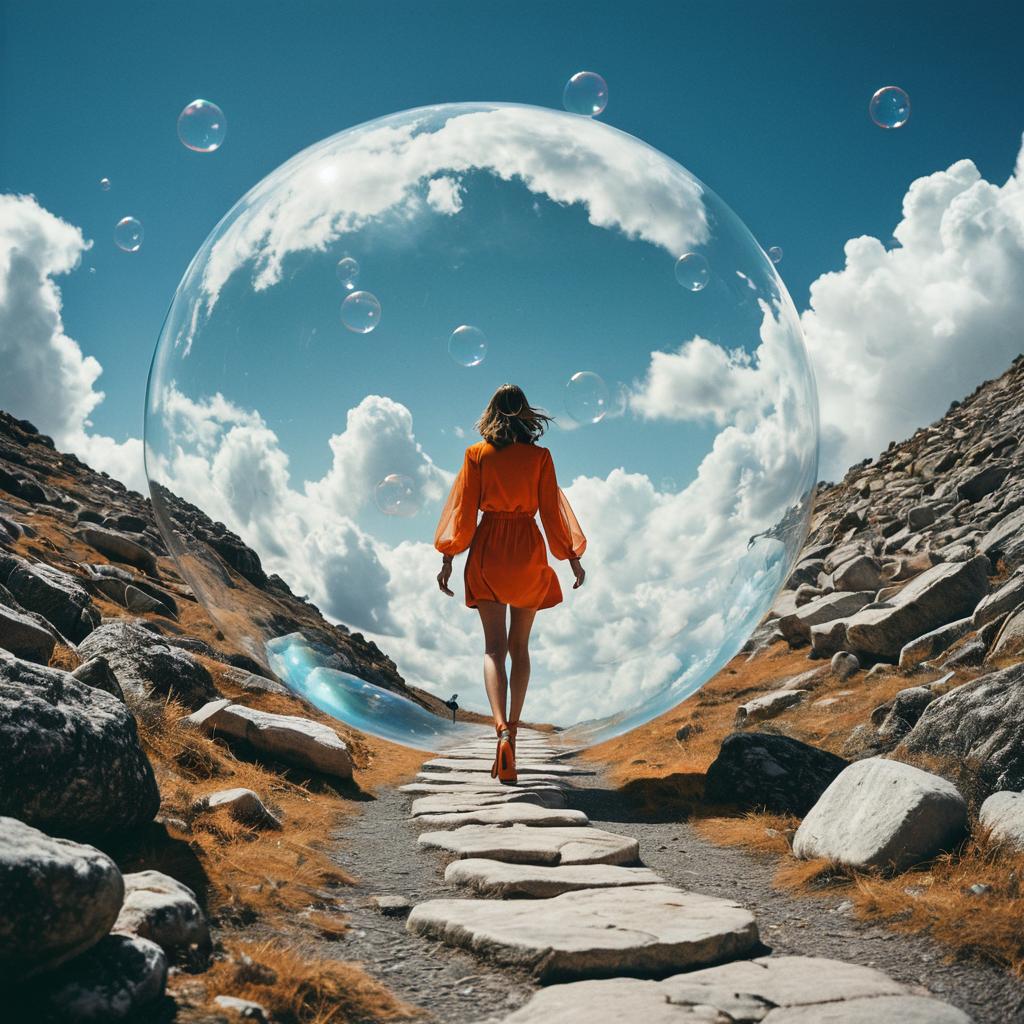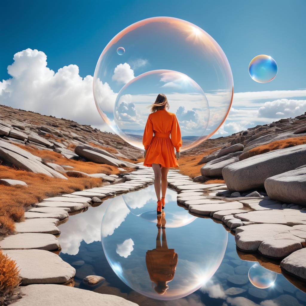 A woman in an orange outfit and heels walking alone on a rocky path under a blue sky filled with fluffy clouds, a large transparent bubble floating above her with distorted reflections inside showing intertwined figures, surreal and dreamlike landscape, soft natural light, muted colors with strong orange and blue contrasts