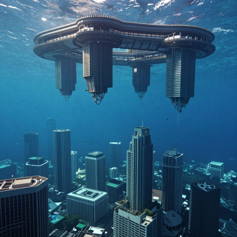 A city suspended upside-down beneath an ocean’s surface, where gravity pulls upward and fish commute to underwater skyscrapers via gravity-defying tunnels.