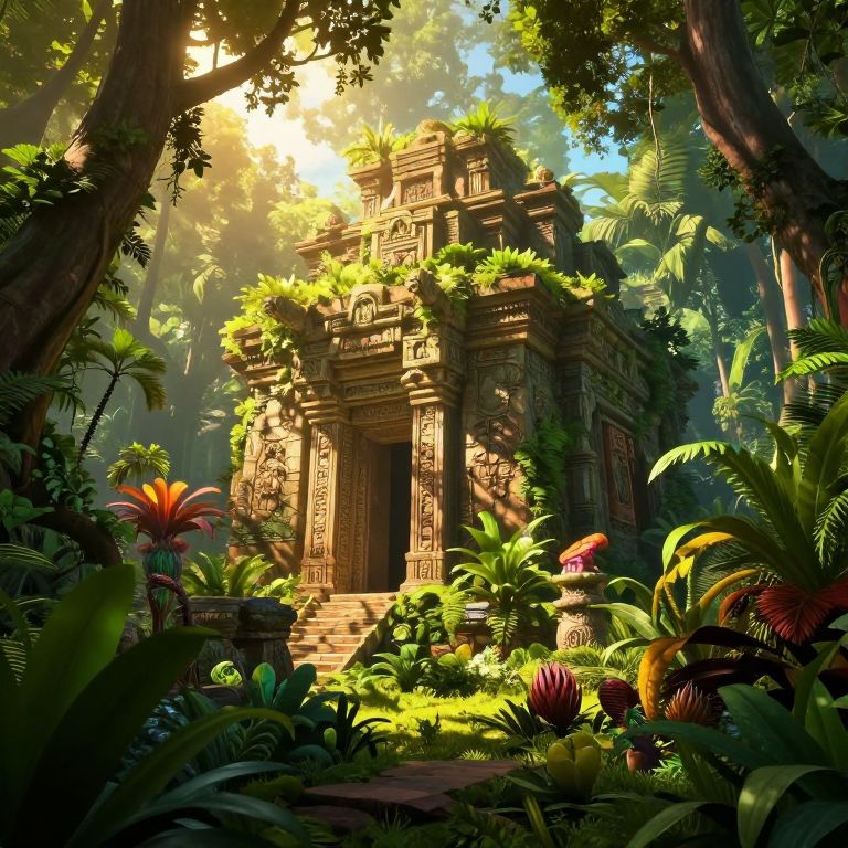 In this enchanting jungle landscape, ancient ruins stand as silent witnesses to a bygone era. The ruins, adorned with lush greenery and vibrant fantasy plantlife, are bathed in the warm, golden light of high noon. Sunlight filters through the dense foliage, casting dappled shadows on the stone structures. The ruins, with their intricate carvings and towering columns, are partially obscured by the dense vegetation, creating a sense of mystery and wonder. The scene is a harmonious blend of nature and architecture, with the ruins and plantlife coexisting in a delicate balance. The overall composition is dynamic, with the ruins positioned centrally, drawing the viewer's eye into the scene, while the surrounding foliage and plantlife add depth and complexity. The interplay of colors, from the rich greens of the vegetation to the warm hues of the sunlight, creates a visually stunning and immersive experience.