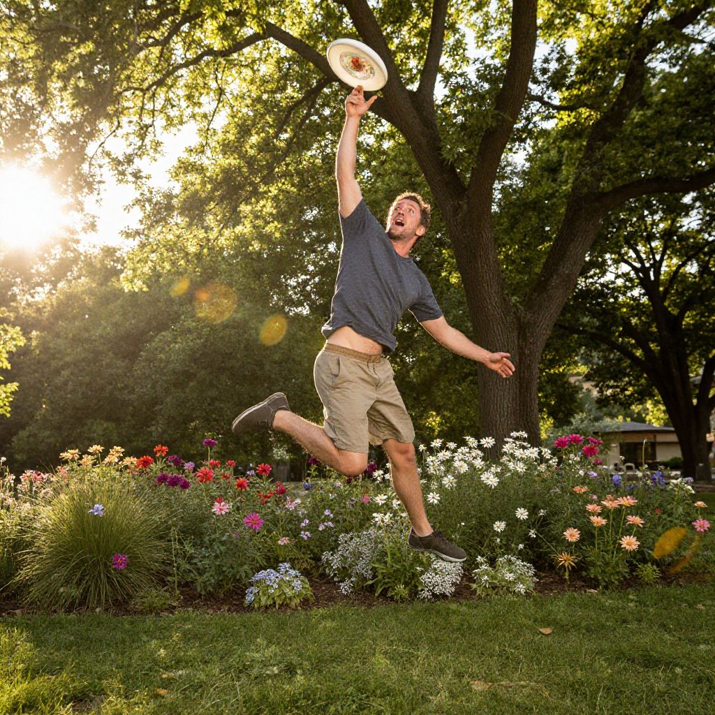 [[man,frisbee image]]Captivating scene: A man, mid-air, tossing frisbee, joyous expression, surrounded by lush greenery, vibrant flowers, and towering trees, bathed in warm golden hour light, dynamic lens flare effects accentuating the movement, sunbeams dancing through leaves, highlighting the thrill of playtime. Man has masculine face and piercing eyes