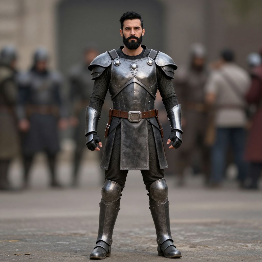 Photograph of a muscular man with dark hair and a full beard, standing confidently in medieval-style armor. He wears a silver-steel chest plate, shoulder pauldrons, and matching gauntlets and greaves, with a brown leather belt and black gloves. His black chainmail is visible underneath the armor. The background is slightly blurred, featuring several other armored men in darker attire and a stone building. The scene has a historical, medieval ambiance with muted colors and soft light. The man's serious expression and upright stance convey strength and readiness.