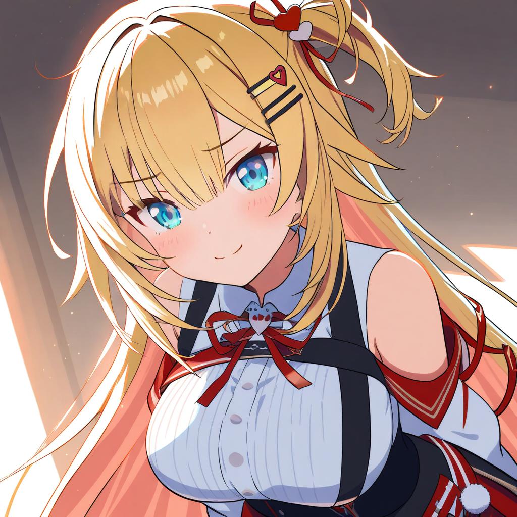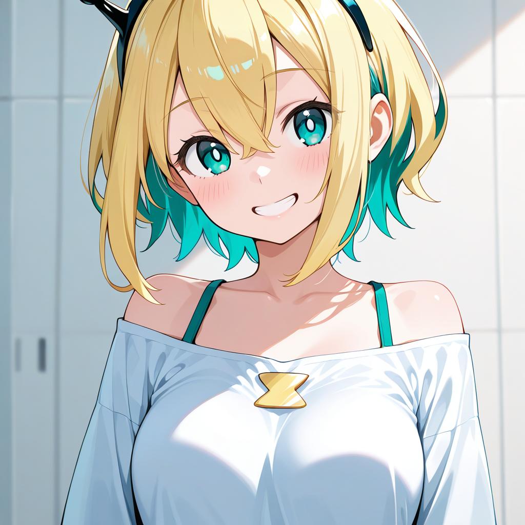 Amano pikamee, voms, 1girl, sharp teeth, green eyes, hair between eyes, white pupils, blonde hair, green hair, two-tone hair, short hair, colored inner hair, black hairband, white shirt, off-shoulder shirt, virtual youtuber, virtual youtuber, by artist wasabi60, illustrious