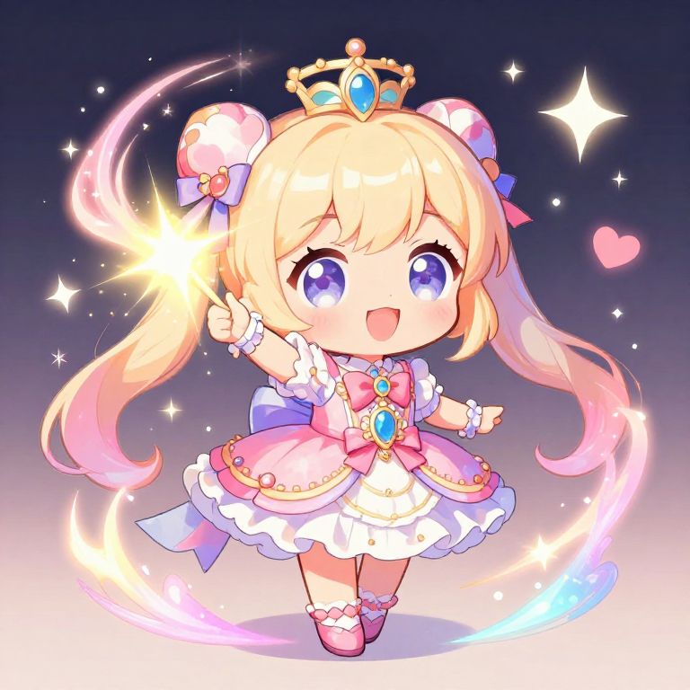 This digital anime-style drawing depicts a chibi, blonde-haired girl with large, sparkling purple eyes, wearing a pink and white frilled dress adorned with blue and pink bows, and a golden crown with a blue gem. She has twin buns on either side of her head, each topped with a pink and blue bow. She is smiling widely, holding a glowing, star-like light in her right hand, and a pink heart floats nearby. The background is a gradient from dark blue to white, with sparkles and light trails surrounding her. Her pink shoes match her dress, and she exudes a magical, cute, and cheerful vibe.