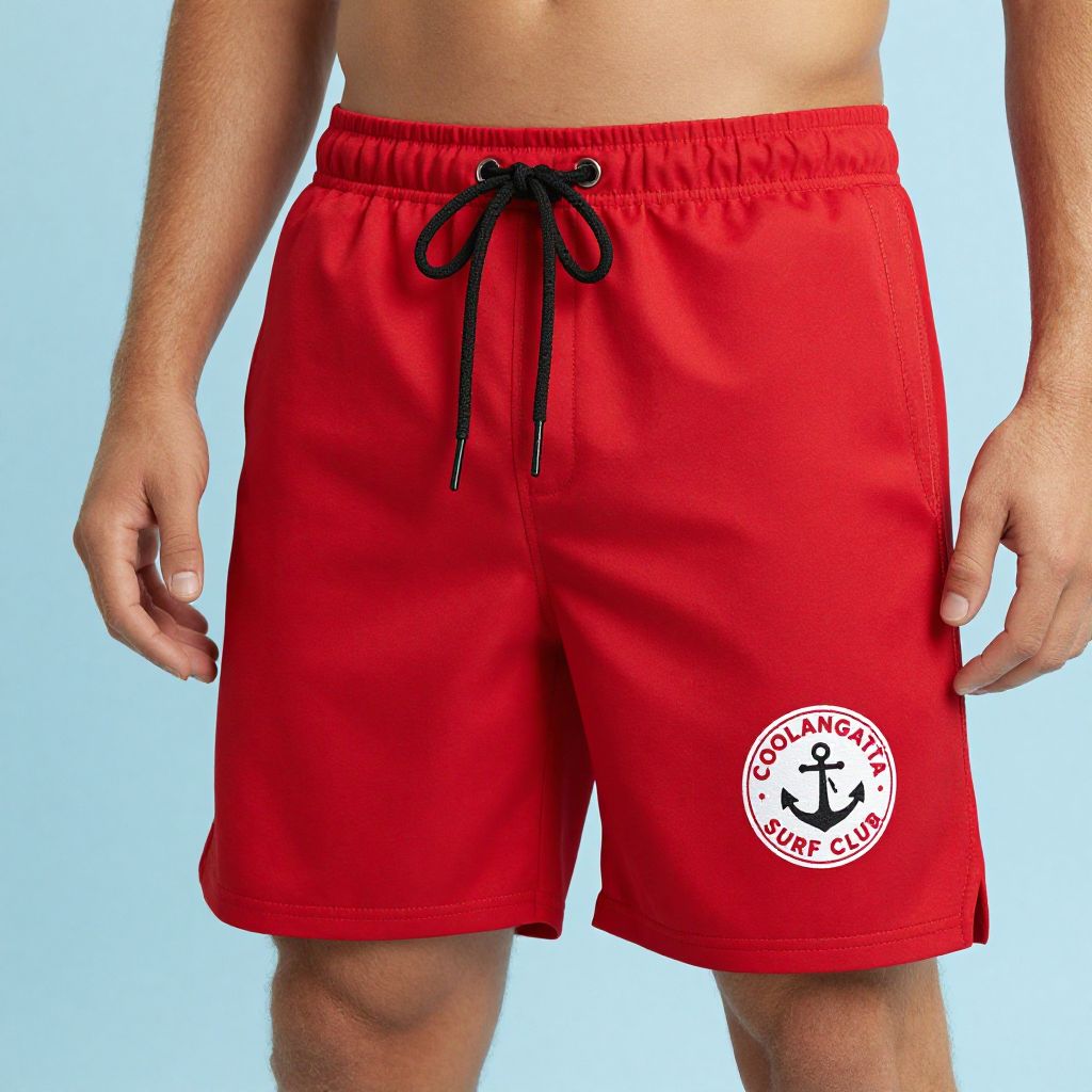 Model showcasing vibrant red Coolangatta Surf Club shorts featuring a circular logo with \"COOLANGATTA SURF CLUB\" text and an anchor design, paired with black drawstrings and side seams.