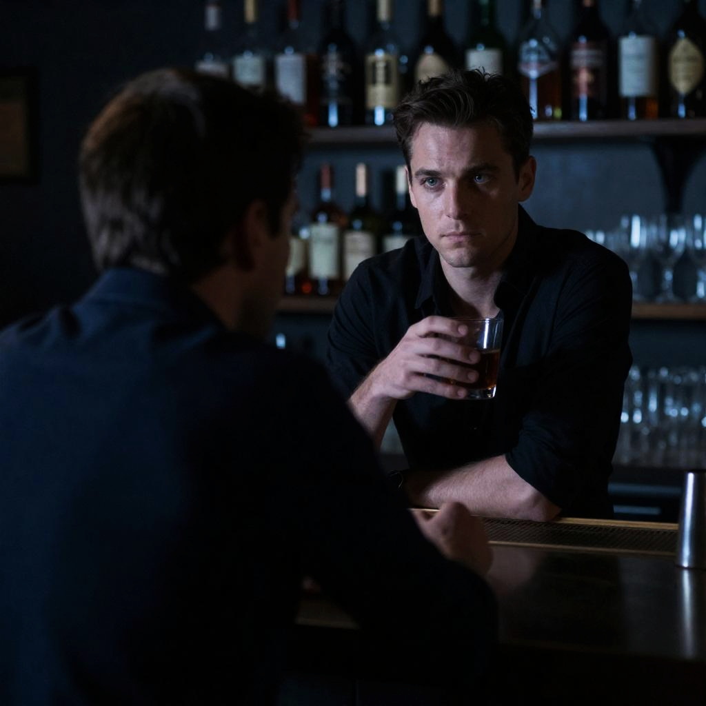 Photograph of a man with short brown hair in a dark suit, pointing aggressively at the camera, intense expression. Background: dimly lit restaurant, wooden tables, chairs, several people seated, some looking away, one person in red jacket. Foreground: wooden bar, glass, black machine. Wicker basket on the right.