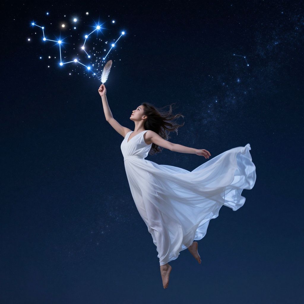 A woman in a flowing white dress gracefully floats against a starry night sky, her hair and dress billowing as she holds a feathered quill, seemingly drawing constellations that bloom into radiant stars, captured in a dreamlike, ethereal digital art style with vivid lighting and a celestial atmosphere.