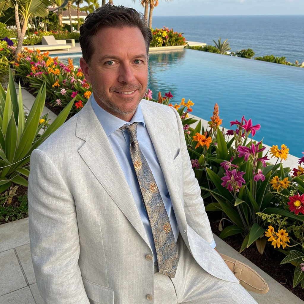 Photograph of a smiling, middle-aged white man with short dark brown hair, wearing a light gray suit, white dress shirt, and patterned silver tie. He is seated outdoors near a vibrant blue infinity pool, with colorful tropical flowers, including orange, pink, and yellow blooms, in the background. The ocean is visible in the distance under a clear blue sky. The man has a slightly tanned complexion and is positioned slightly to the left, with his right hand resting on his lap. The setting exudes a luxurious, tropical resort vibe.
