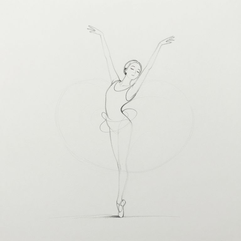 Minimalist line drawing of a ballet dancer in a leotard and tights, standing en pointe with arms raised gracefully above.