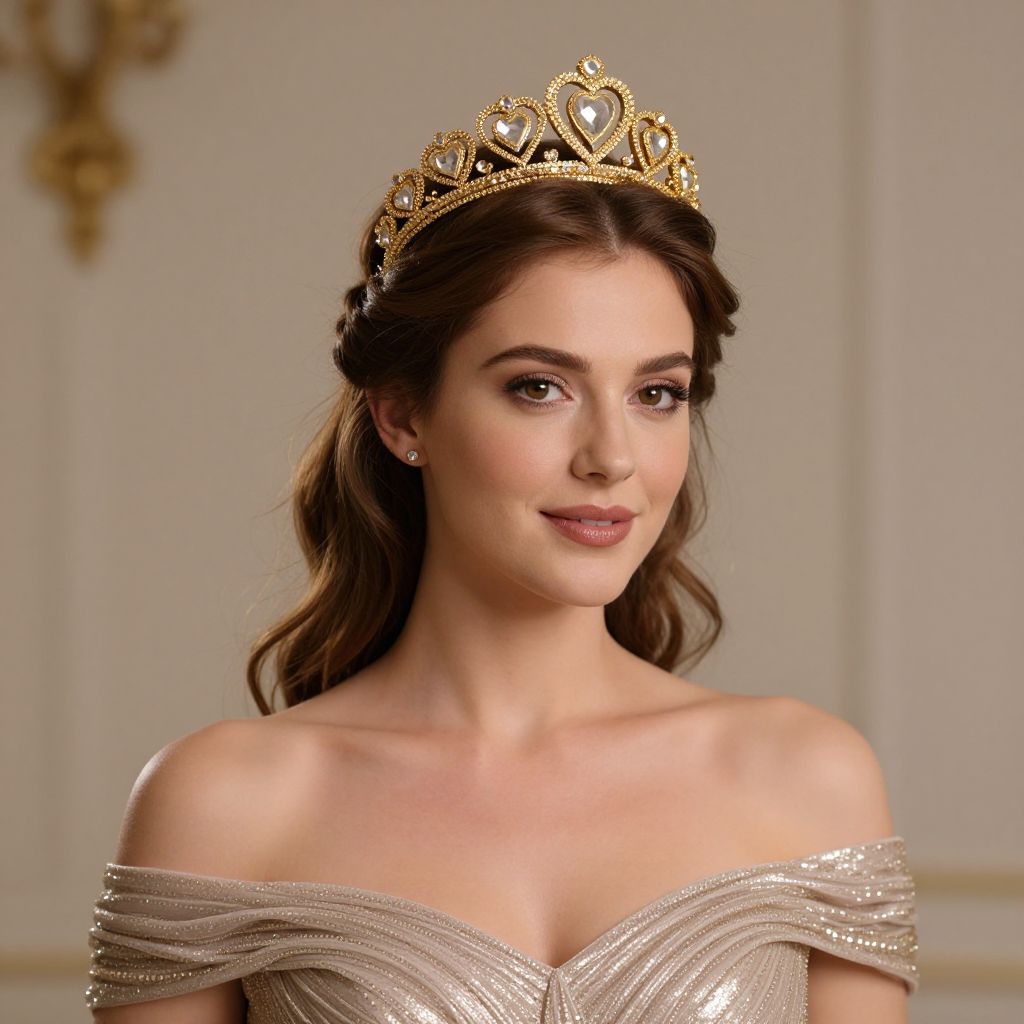 Elegantly poised, a woman dons a handmade gold tiara featuring intricate heart motifs and sparkling gemstones, complemented by her flowing brown hair styled in an updo and a shimmering off-the-shoulder gown, embodying the regal essence of Princess Florina or any classical royal character.