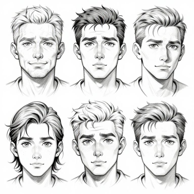 Six black-and-white digital pencil sketches of handsome men with varied hairstyles, all featuring clean lines and expressive eyes.