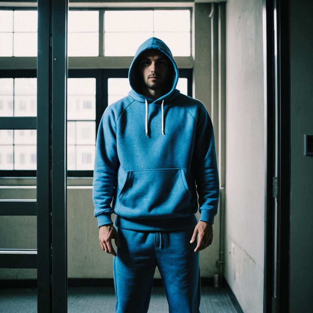 Fleece Jogger Sweatpants, man in a gray hoodie and sweatpants standing in a garden