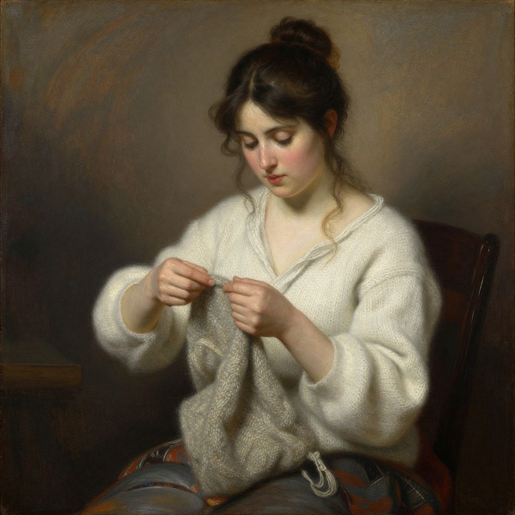 This digital painting depicts a young woman with fair skin and brown hair in a braid, wearing a white, textured, woolen sweater. She is sitting on a wooden chair, gently holding a blue and white knitted blanket. Her eyes are downcast, and her expression is calm and focused. The background is a simple, muted brown, drawing attention to her. A wooden table with a white cloth is partially visible on the left. The painting style is realistic with soft, painterly textures, emphasizing warmth and quiet concentration.