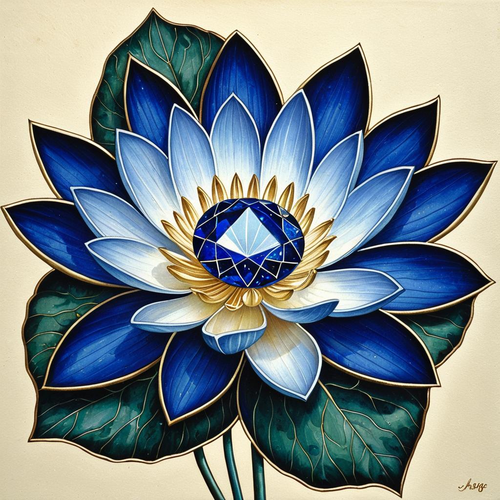 Detailed painting of a lotus flower featuring elongated blue and white petals, surrounded by dark green leaves with golden outlines. The center of the flower is adorned with a blue diamond lapis lazuli stone, rendered in the cloisonnism style using gouache and airbrush techniques. The artwork exhibits intricate detailing and vibrant colors.