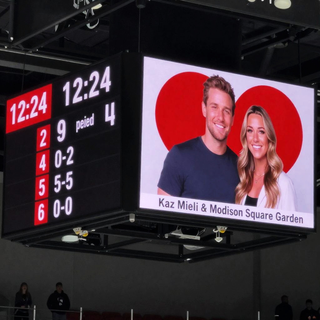 Digital scoreboard displaying Kings vs. Kings hockey game. Scoreboard shows game time 12:24, Kings 9, Period 4. Right side features photo of smiling man and woman with red heart background, "Kaz Mieli" and "Modison Square Garden". Left side has Kings' scores in red, black background. Three-sided scoreboard structure with lights and metal framework. Two people in background, partially visible.