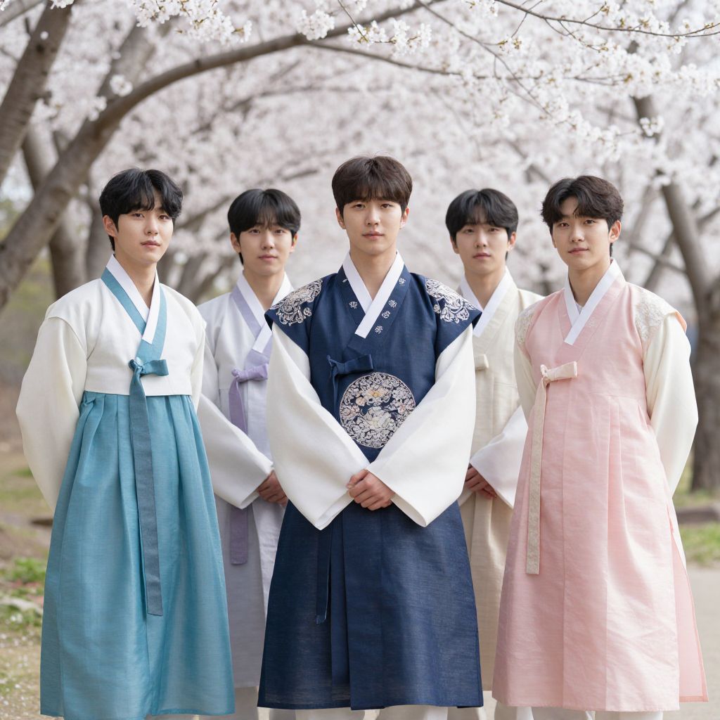 Photograph of five young Asian men in traditional Korean hanbok, standing in a cherry blossom garden. They wear different colors: blue, white,