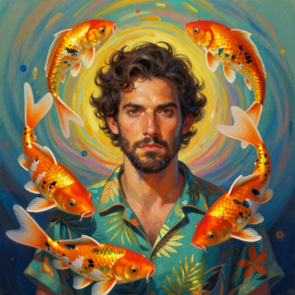 Digital artwork of a man with black-rimmed glasses, wearing a suit, surrounded by colorful birds with vibrant feathers perched on his head. Background