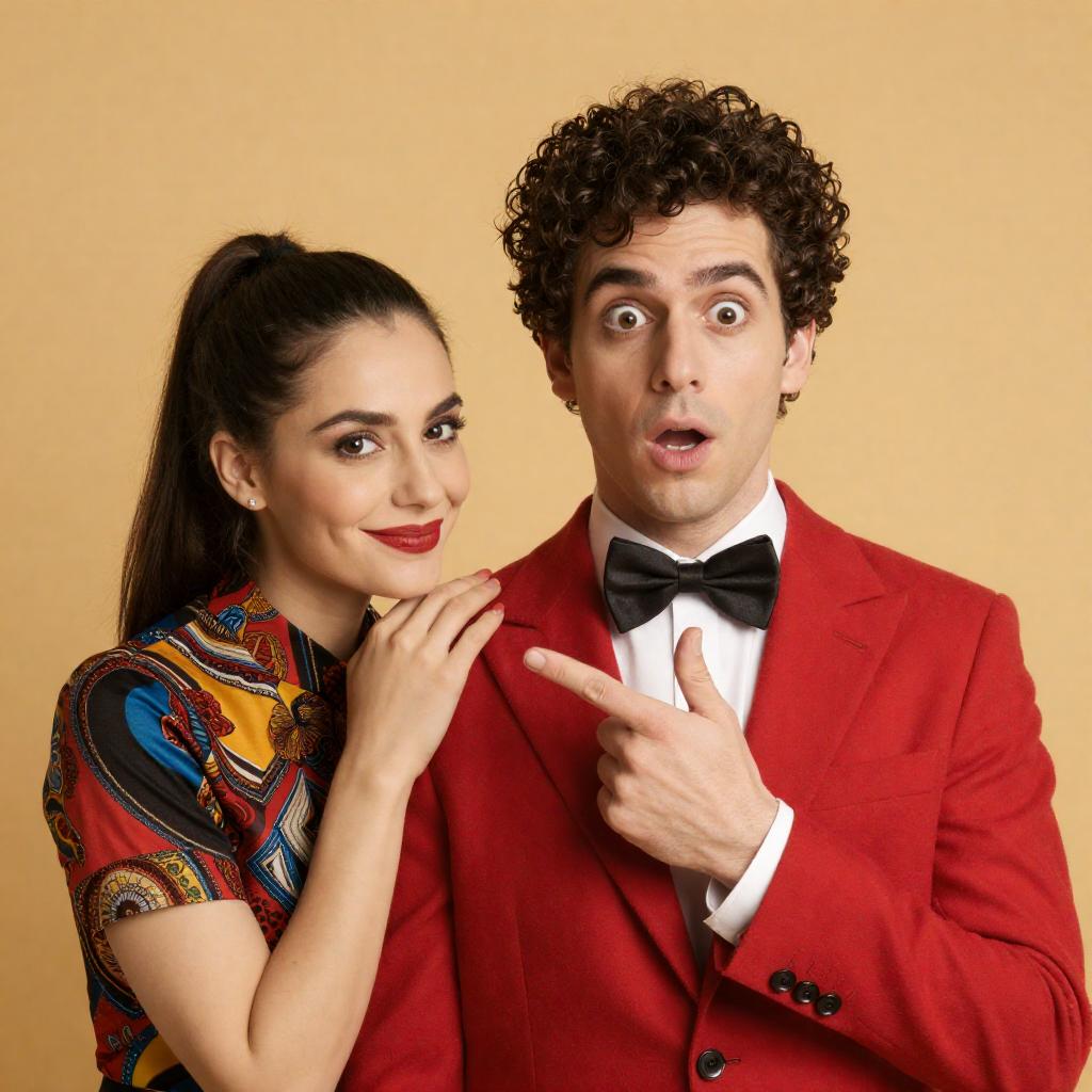 Photograph of a man and woman. Man with dark curly hair, red coat, black bow tie, pointing, surprised expression. Woman with dark hair in a ponytail, red lipstick, colorful patterned blouse, smiling. Yellow background. Both close together, woman leaning on man.