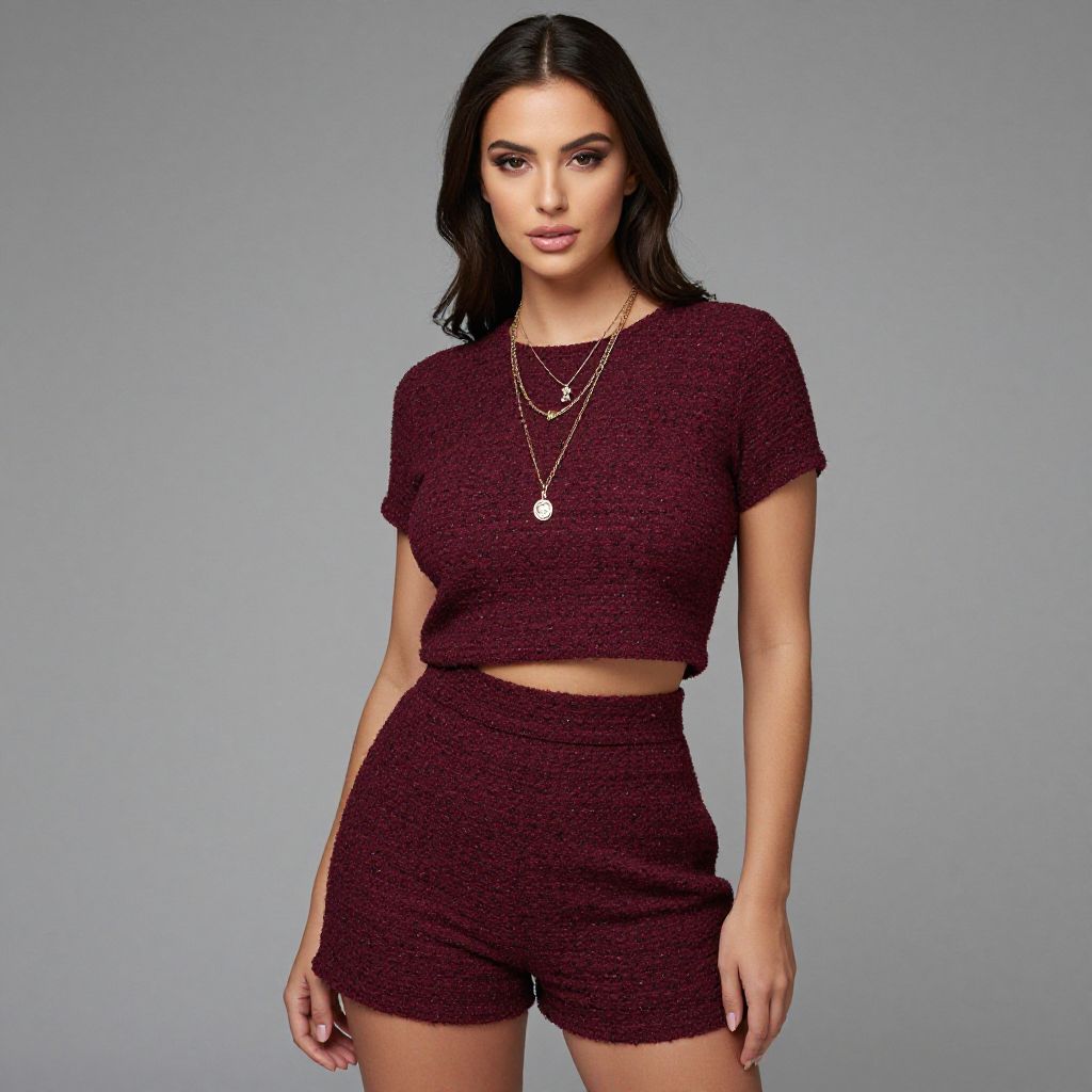 "Woman, contemporary casual, tweed-like textured co-ord set in burgundy with flecks of black, short-sleeve cropped top with a simple round neckline, matching high-waisted shorts, layered gold necklaces with pendants, studio background with a neutral gray gradient.. Sexy. Pretty face and beаutiful eyes. Big breasts."