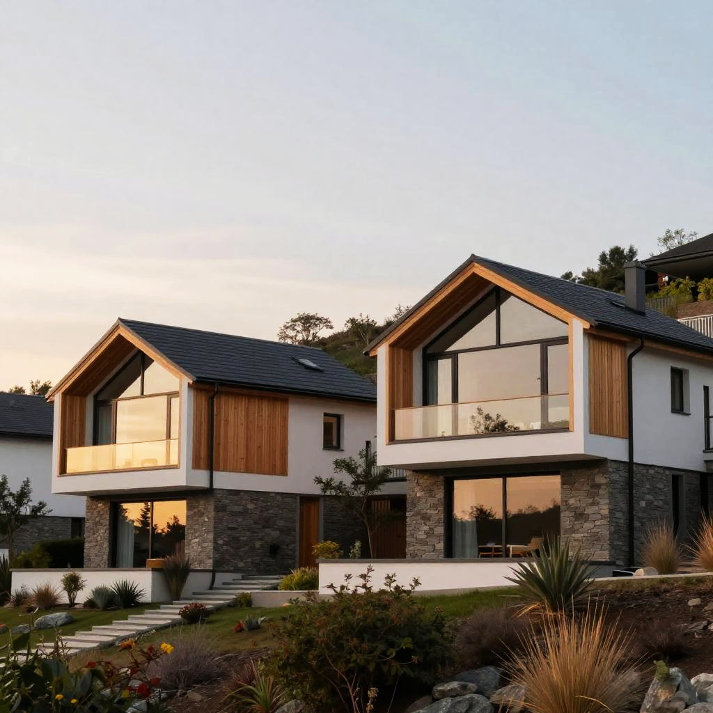 Contemporary sloped roof houses nestled on a hillside at sunset, clean lines, large glass windows, natural wood and stone materials, serene modern architecture, soft warm lighting