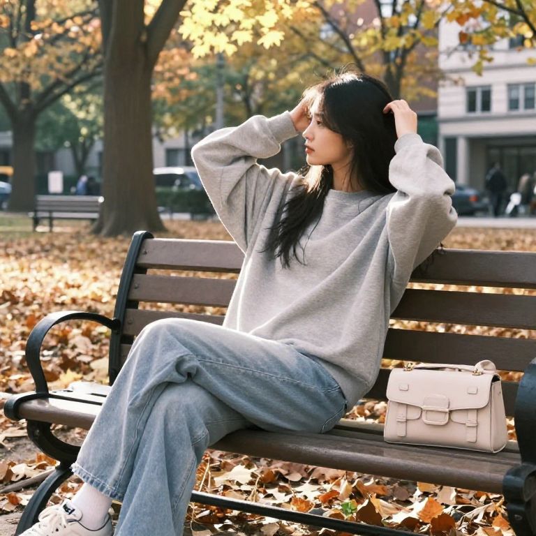 Photograph of an Asian woman with long black hair, sitting on a wooden park bench. She wears a light gray oversized sweatshirt and loose blue jeans. Her left hand is raised, adjusting her hair, while her right hand rests on her head. A white handbag with a gold clasp sits on the bench beside her. The background features autumn foliage with yellow and orange leaves, a blurred building, and other park benches. The lighting is soft, creating a warm, serene atmosphere.