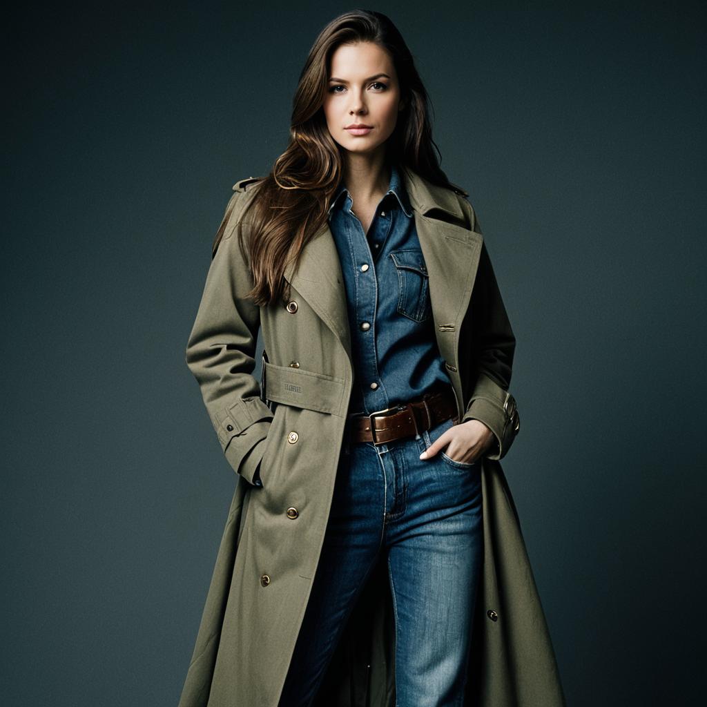 Military coat woman,1girl, solo, realistic, coat, long hair, brown hair, pants, trench coat, denim, belt, jeans, shirt, standing