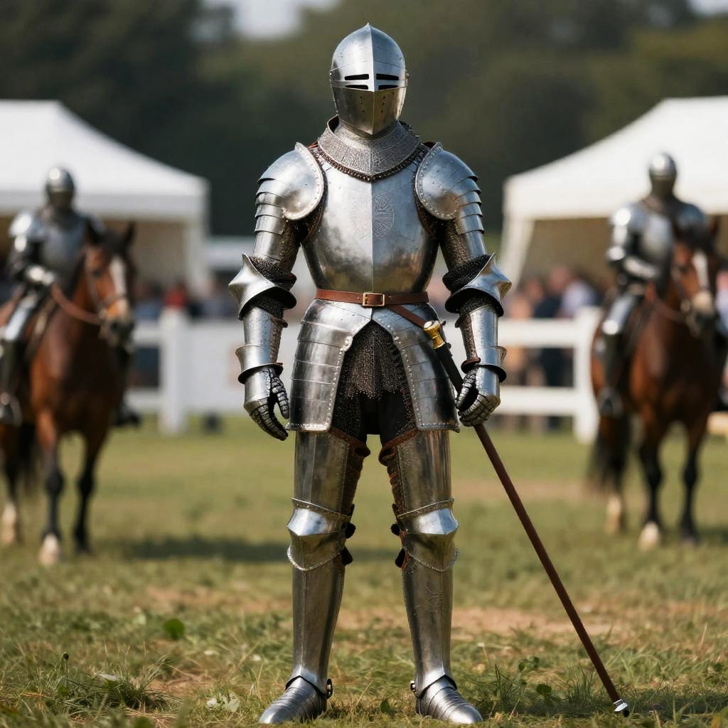 Photograph of a medieval knight in shiny silver armor, holding a sword, standing in a grassy field with blurred horses and white tents in the background
