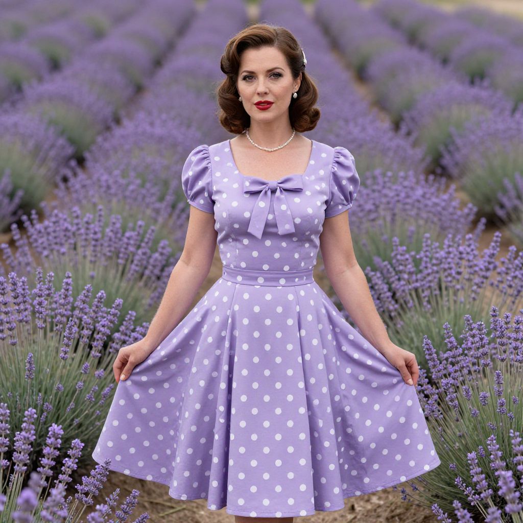 A woman stands gracefully in a lavender field wearing a vintage-inspired, lilac polka dot dress with puff sleeves and a bow neckline. Her classic hairstyle and red lipstick complement the retro aesthetic, creating an elegant and nostalgic atmosphere amid the vibrant purple rows of flowers.