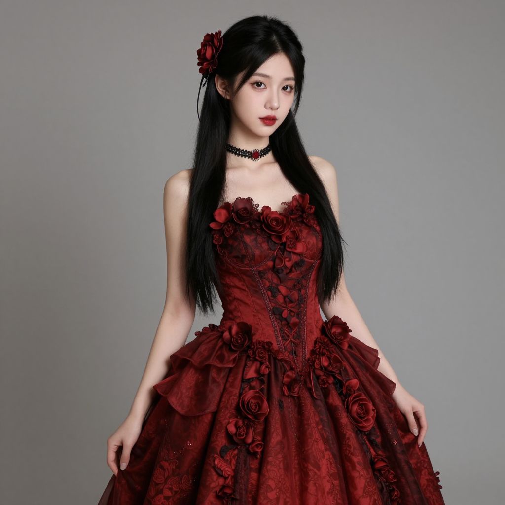 Gothic red wedding dress, 1girl, solo, dress, flower, red dress, drill hair, long hair, choker, hair flower, black hair