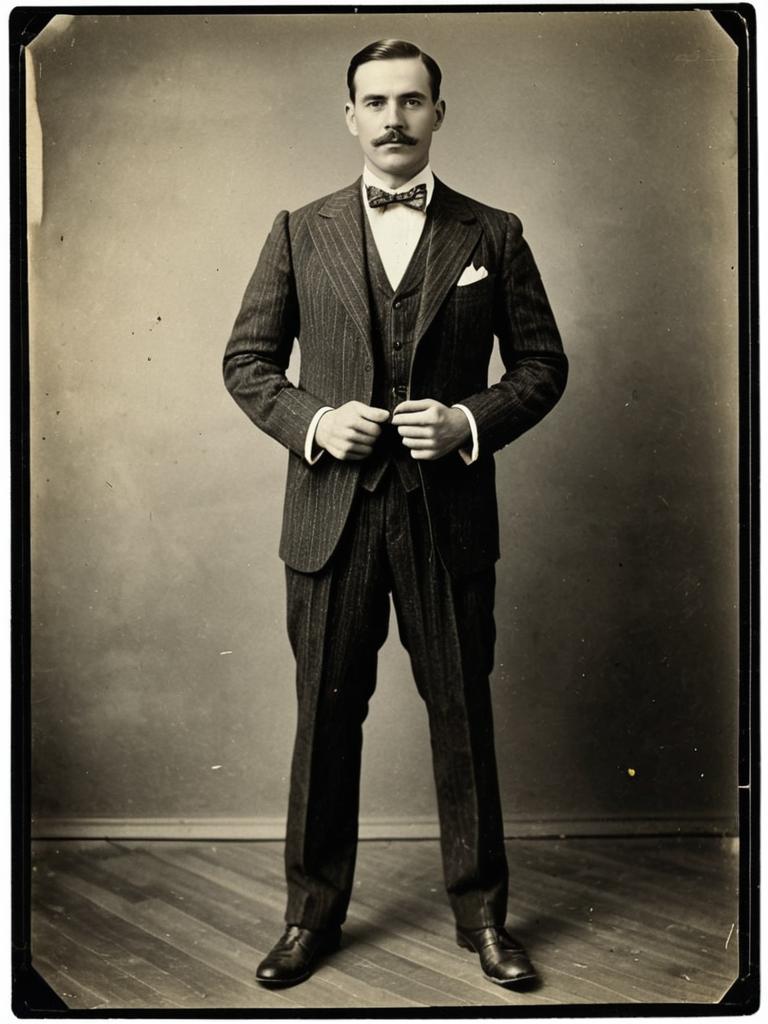 Man in 1920s Attire, full-body retro suit photo with bow tie