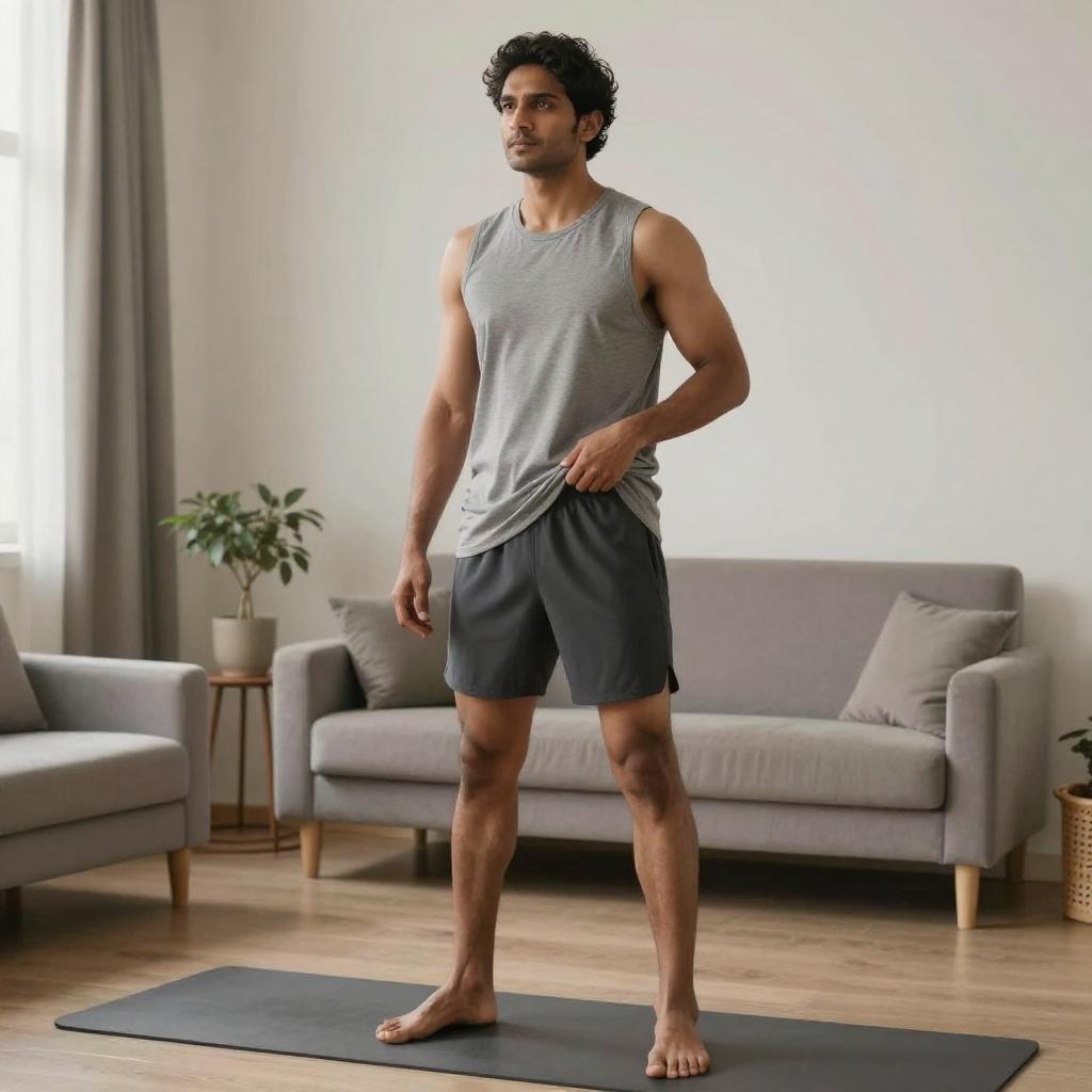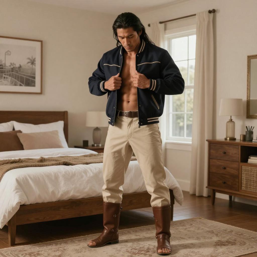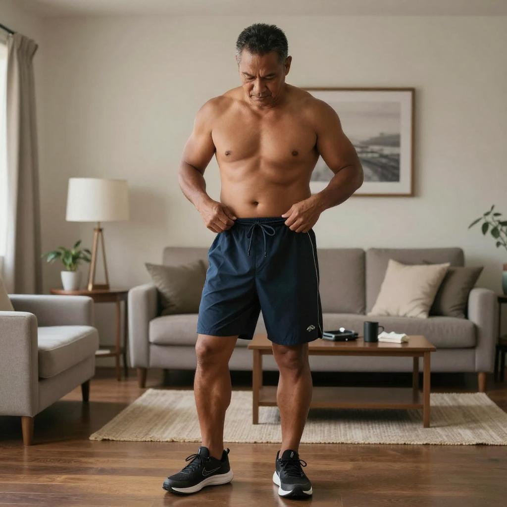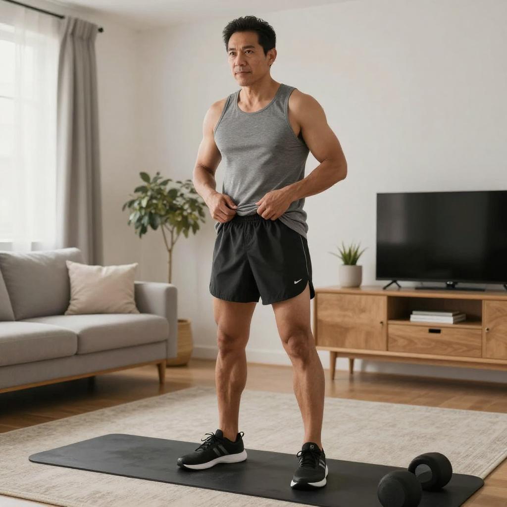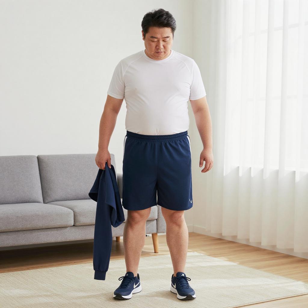 Wide shot of a whole-body figure of a 39-year-old Asian man, slightly overweight, getting dressed in sports clothes at home, realistic commercial photo